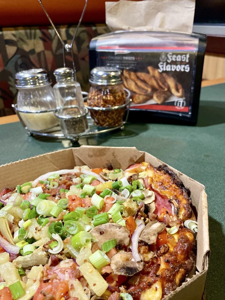 The original polynesian pizza. Ham, crisp bacon, juicy pineapple, tomatoes, red and green onions on polynesian sauce.